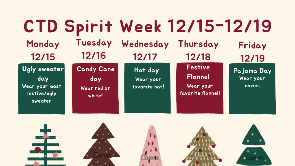 Next week will be CTD Spirit Week! We would enjoy having students participate as much as possible. You can be sure that school staff will be participating too. This will make the last week before winter break a fun one for sure!